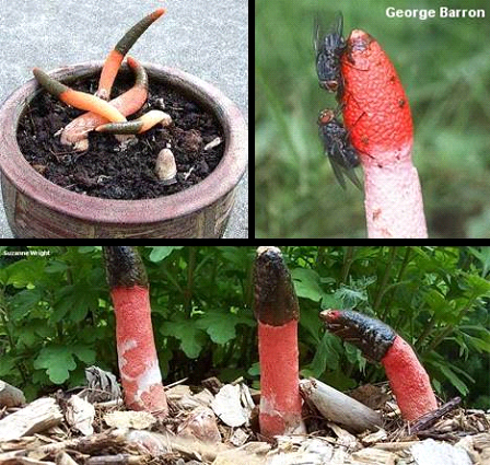 蛇頭菌學(xué)名為“Mutinus Caninus”,可以稱得上是最丑陋的菌類。蛇頭菌菌柄呈圓柱形,菌蓋呈鮮紅色,菌蓋頂端長(zhǎng)有惡臭氣味的粘稠狀孢子。
